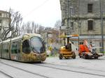 - Au centre droit de la photo, prise le mardi 5 janvier 2016, place Albert 1er à Montpellier, un engin de chantier stationné en vue de l’installation de la ligne aérienne de contact. Copyright : Anje34