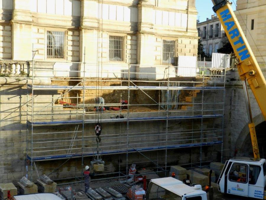 Boulevard du Professeur Louis-Vialleton à Montpellier, une partie du mur de soutènement de la coursive extérieure du Palais de Justice est déconstruite bloc de pierre par bloc de pierre. Photo prise le mercredi 13 janvier 2016. Copyright : Anje34