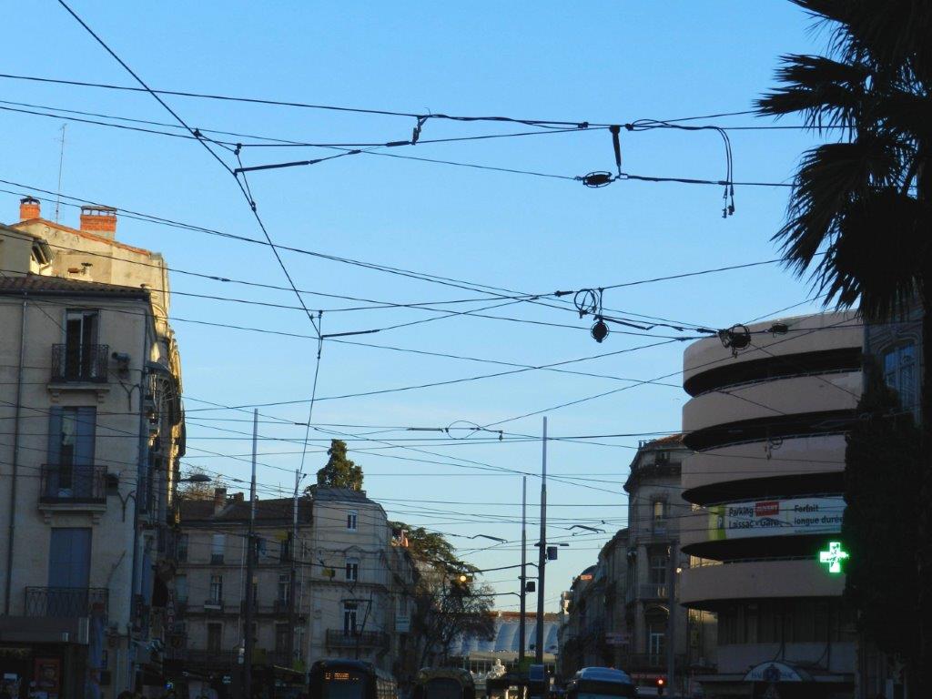 Des câbles de soutien de lignes aériennes de contact dans tous les sens, place Edouard-Adam à Montpellier. Photo prise le mercredi 13 janvier 2016. Copyright : Anje34