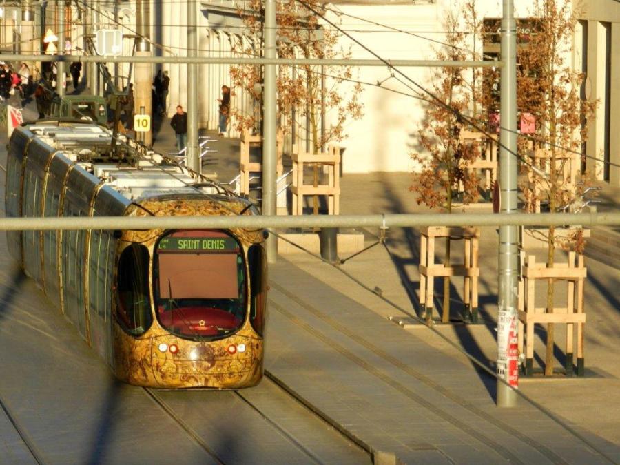 Une rame Citadis 302 Alstom opérant sur la ligne 4 circule en direction du terminus « Saint-Denis » à la hauteur du nouveau parvis de la gare de Montpellier Sain-Roch, où quatorze arbres viennent d’être plantés. Photo prise le vendredi 15 janvier 2016. Copyright : Anje34
