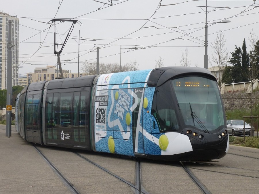 Open Sud de France 2016, Montpellier Méditerranée Métropole la joue perso. Photo de la rame 2098 Citadis 402 Alstom prise sur le faisceau de la station « Mosson » commune aux lignes 1 et 3 de tramway, le mercredi 27 janvier 2016. Copyright : Louis Ferdinand