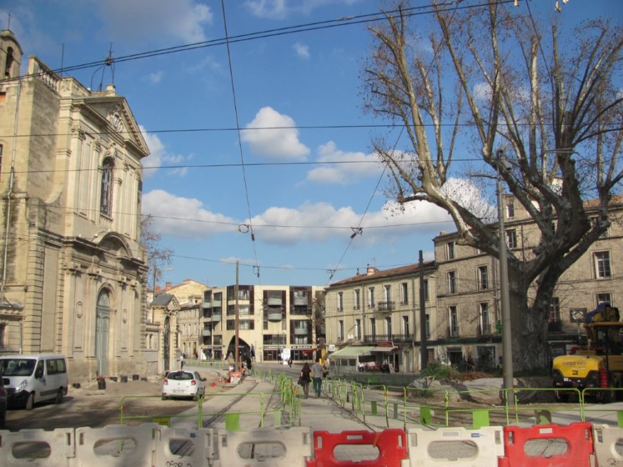 Aperçu des câbles de soutien et des lignes aériennes de contact place Albert 1er à Montpellier, côté ancien Hôpital Général, le vendredi 29 janvier 2016. Copyright : Edouard Paris