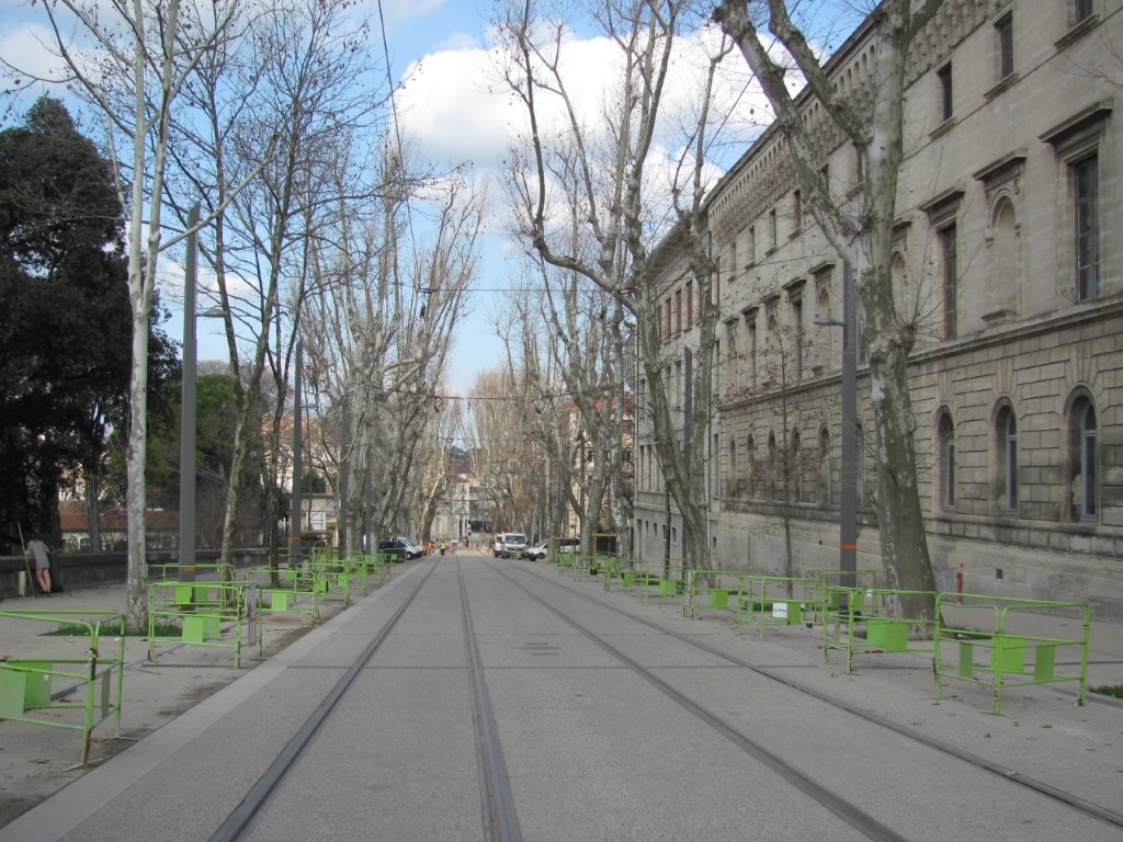 Aperçu des câbles de soutien et des lignes aériennes de contact boulevard Henri IV à Montpellier, le vendredi 29 janvier 2016. Copyright : Edouard Paris