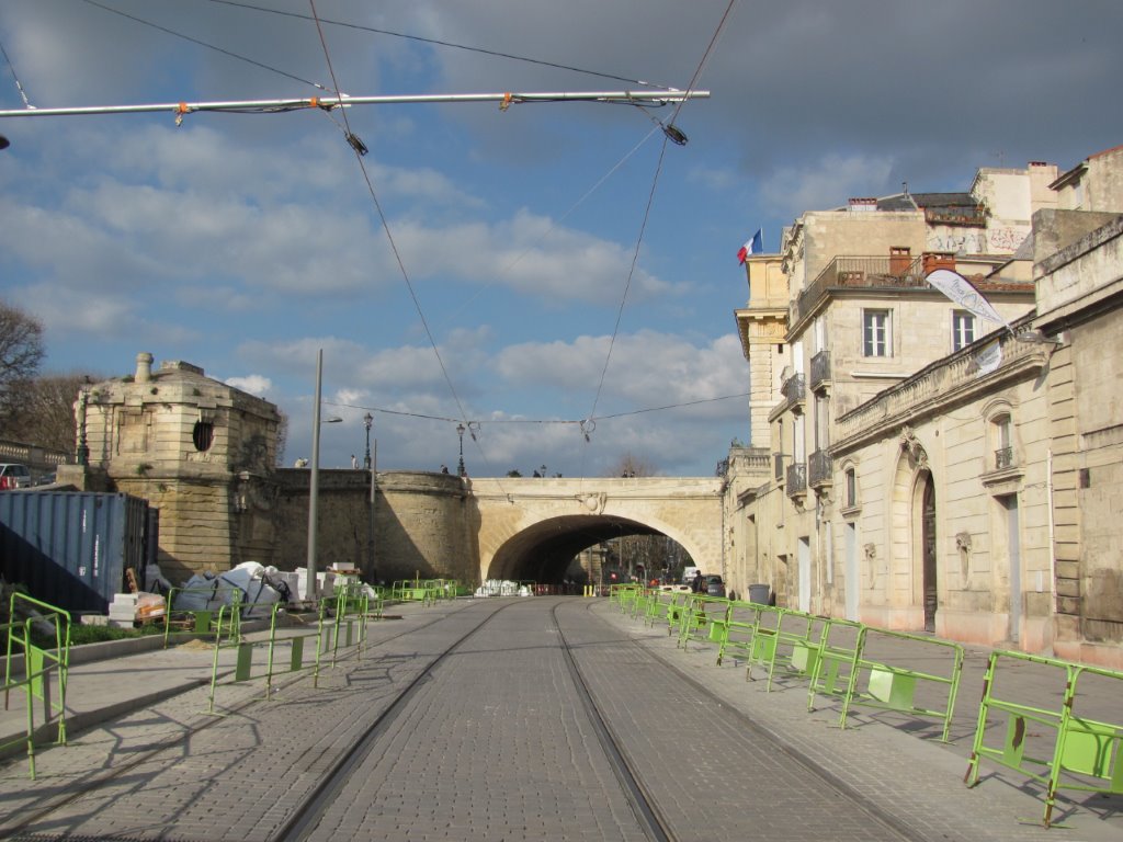 Aperçu d’une potence et de câbles de soutien des lignes aériennes de contact boulevard Ledru-Rollin à Montpellier, partie sud, le vendredi 29 janvier 2016. Copyright : Edouard Paris
