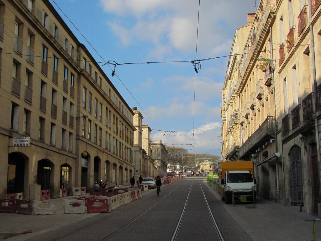 Aperçu des câbles de soutien et des lignes aériennes de contact boulevard Ledru-Rollin à Montpellier, le vendredi 29 janvier 2016. Copyright : Edouard Paris