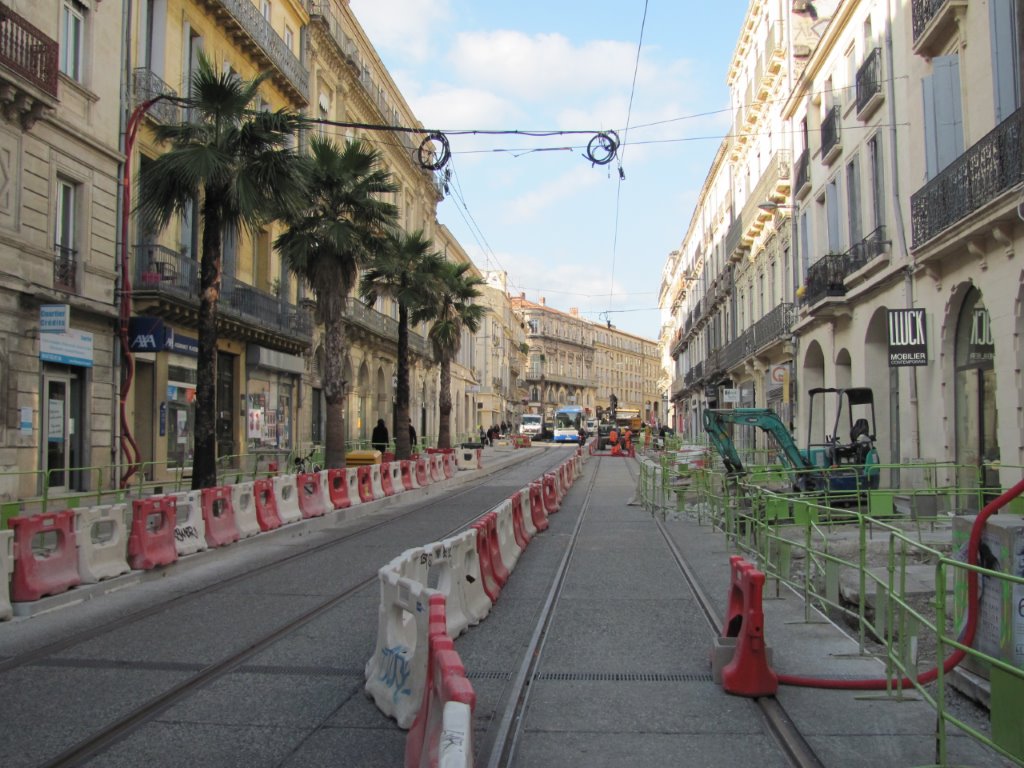 Aperçu des câbles de soutien et des lignes aériennes de contact boulevard du Jeu-de-Paume à Montpellier, entre la rue André-Michel et la rue du Faubourg du Courreau, le vendredi 29 janvier 2016. Copyright : Edouard Paris