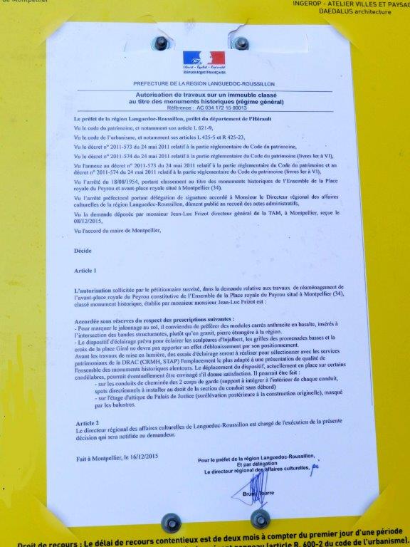 Panneau d’autorisation de travaux concernant le corps de garde de la rue de La Blottière à Montpellier, classé aux monuments historiques. Photo prise le vendredi 5 février 2016. Copyright : Anje34