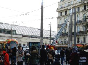 - La grande échelle a été déployée, place Auguste-Gibert à Montpellier, consécutivement à l’incendie qui a éclaté au premier étage de l’immeuble au pied duquel se trouve la Brasserie de la Gare, le lundi 8 février 2016 peu après 16h00. Copyright : Anje34