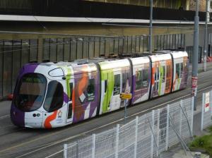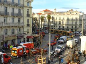 - Zoom sur la rue Jules-Ferry à Montpellier, où les rames ont été stoppées de part et d’autre de la place Auguste-Gibert, pantographes abaissés, durant l’intervention des pompiers sur un incendie dans un immeuble situé face à la gare Saint-Roch, le lundi 8 février 2016 après-midi. Copyright : Anje34