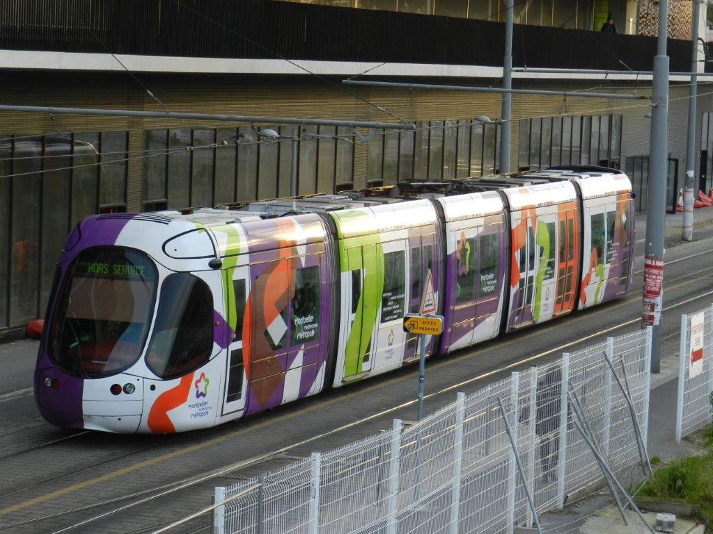 La rame 2049 Citadis 302 Alstom est photographiée pantographe abaissé, rue Alexandra David-Néel, l’alimentation électrique sur le secteur du centre-ville de Montpellier ayant été coupée en raison d’un incendie dans un immeuble situé non loin de là, place Auguste-Gibert, le lundi 8 février 2016 après-midi . Copyright : Anje34