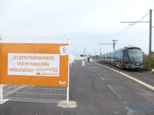 - Le vendredi 12 février 2016, la rame 2089 Citadis 402 Alstom longe la nouvelle station Vélomagg libre-service « Pérols – Etang de l’Or » à son arrivée terminus éponyme de la ligne 3. Copyright : Louis Ferdinand