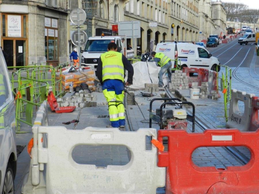 Sur le haut du boulevard du Jeu-de-Paume à Montpellier, déchaussement de pavés au marteau-piqueur, le jeudi 11 février 2016. Copyright : Anje34