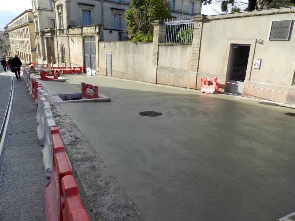 Du béton désactivé fraîchement coulé sur le trottoir élargi du boulevard Ledru-Rollin, côté numéros pairs, le jeudi 11 février 2016. Copyright : Anje34