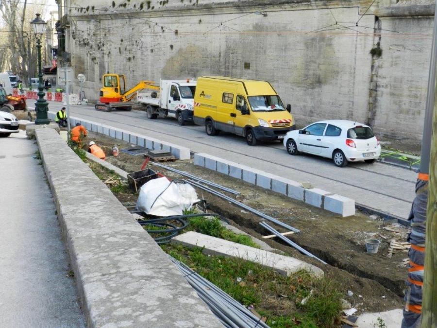 Le quai de la future station « Peyrou – Arc de Triomphe », en contrebas de la rue de La Blottière et de la place d’Aviler à Montpellier, paraît décalé par rapport au quai qui sera situé en contrebas de la coursive extérieure du Palais de Justice. Photo prise le jeudi 11 février 2016. Copyright : Anje34