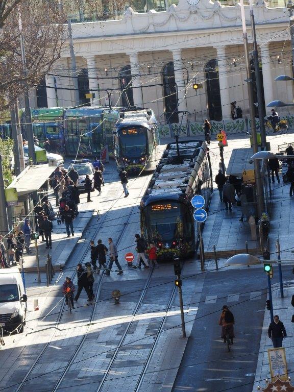 Zoom sur la station « Gare Saint-Roch » des lignes 3 et 4 de tramway, rue de la République à Montpellier, depuis le parking Laissac, le vendredi 19 février 2016, à la veille de la fermeture définitive de ce parc de stationnement. Copyright : Anje34