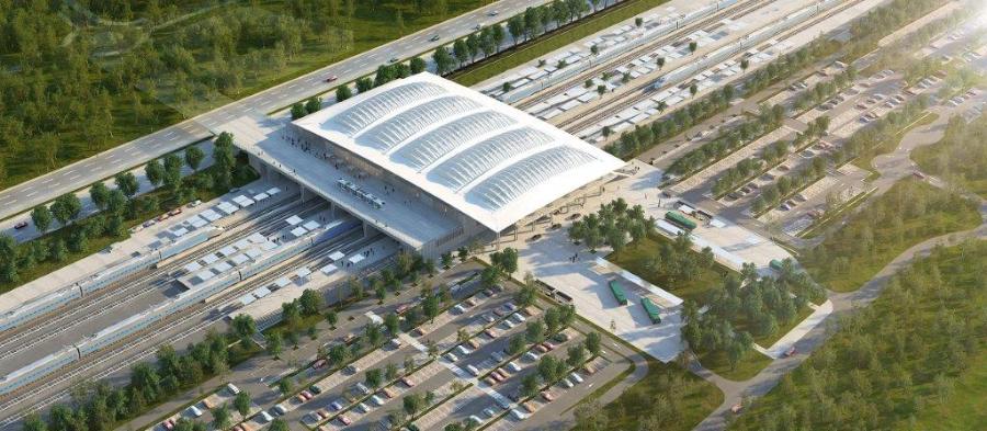 Vue aérienne de la future gare TGV Montpellier Sud de France. Image de synthèse : AGENCE MIMRAM / IDA+ (présentation le 24/07/2014)