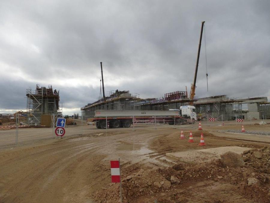 Livraison des poutres destinées à la réalisation de la dalle supérieure sur laquelle sera édifiée la future gare TGV Montpellier Sud de France, le jeudi 11 février 2016. Copyright : Michel Bozzola