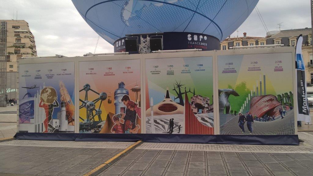 1935 Bruxelles, 1937 Paris, 1939 New York, 1949 Port-au-Prince, 1958 Bruxelles, 1962 Seattle, 1964 New York, 1967 Montréal, 1970 Osaka, 1992 Séville, 1998 Lisbonne, 2000 Hanovre, 2010 Shanghai, 2015 Milan. Photo prise sur la place de la Comédie à Montpellier, le vendredi 26 février 2016. Copyright : Edouard Paris