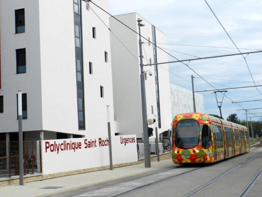 Une rame fleurie de la ligne 2 passe le long des bâtiments de la nouvelle Polyclinique Saint-Roch, quartier des Grisettes à Montpellier, le 26 février 2016. Copyright : Anje34