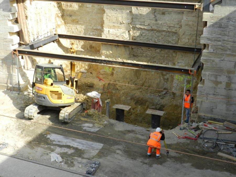 Des techniciens tirent des niveaux au bord de la fosse aux ascenseurs de la future station « Peyrou – Arc de Triomphe », le vendredi 26 février 2016. Copyright : Anje34