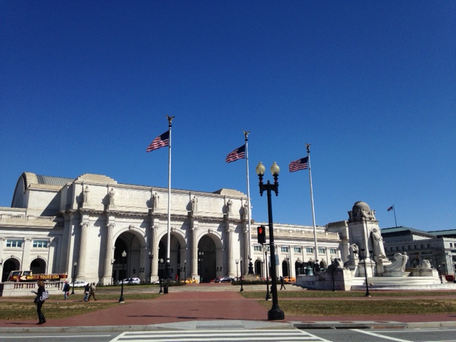 Façade sud-ouest de la gare « Union Station » à Washington, D.C., et statue de Christophe Colomb photographiées le mardi 1er mars 2016. Le terminus « Union Station » du tramway se trouve à six cents mètres de l’endroit où a été prise la photo, au nord-est sur un pont au-dessus des voies ferrées. Copyright : Karine D