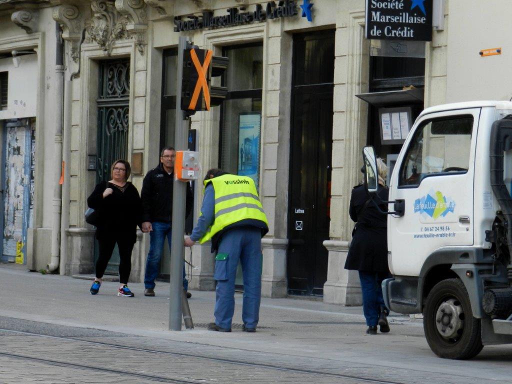 Installation de la signalisation tramway, boulevard du Jeu-de-Paume à Montpellier, le mardi 1er mars 2016. Copyright : Anje34