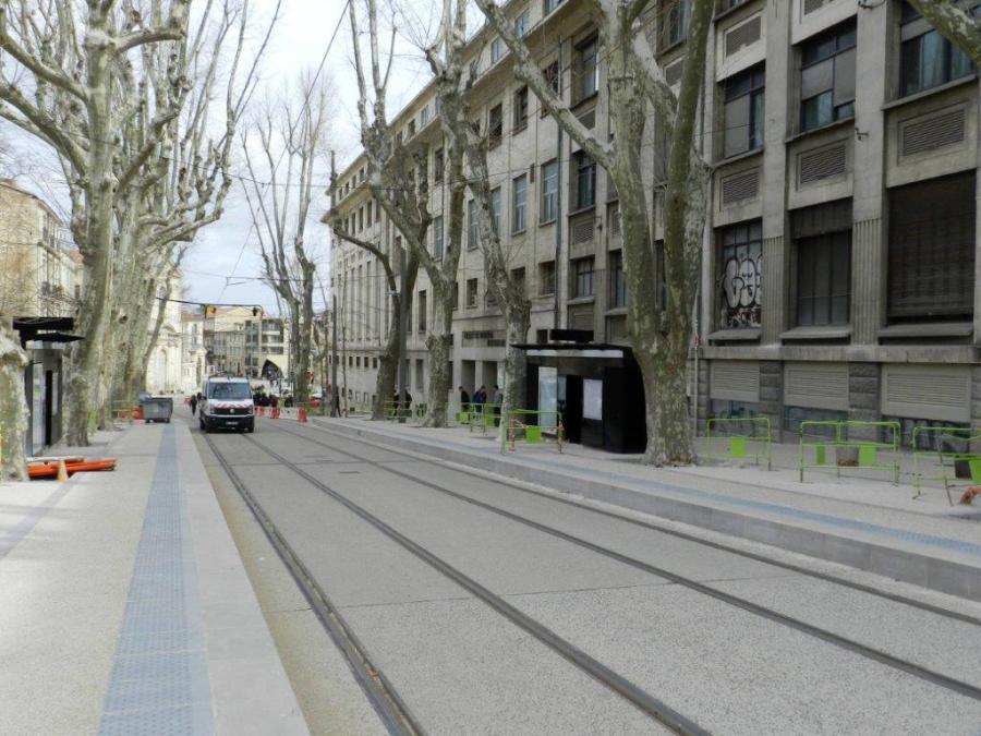 Installation du premier mobilier de station sur chaque quai de la future station « Albert 1er – Cathédrale », boulevard Henri IV à Montpellier, le jeudi 3 mars 2016. Copyright : Anje34