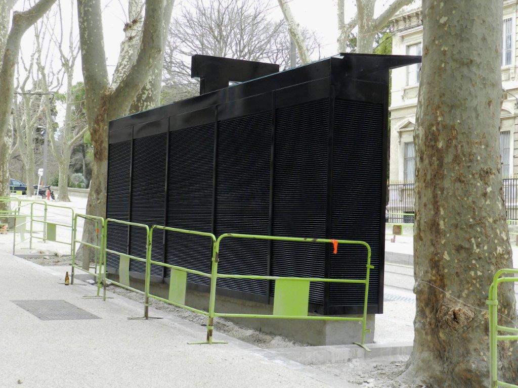 Côté obscur du mobilier de station installé sur un des quais de la future station « Albert 1er – Cathédrale », boulevard Henri IV à Montpellier, le jeudi 3 mars 2016. Copyright : Anje34