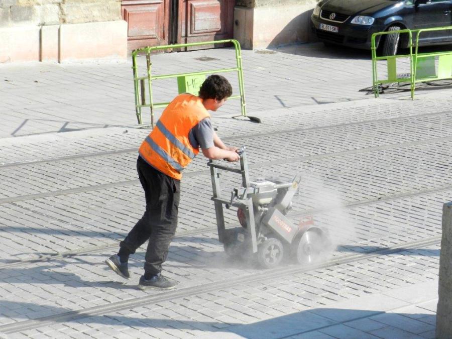 Boulevard du Professeur Louis-Vialleton, côté sud, ébarbage mécanique de reste de béton ou de mortier le long des rails, le samedi 12 mars 2016. Copyright : Anje34