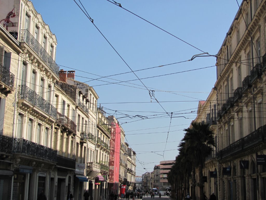 Câbles et lignes aériennes de contact dans tous les sens boulevard du Jeu-de-Paume à Montpellier, à la hauteur de la rue André-Miche, photographiés le samedi 12 mars 2016. Copyright : Edouard Paris