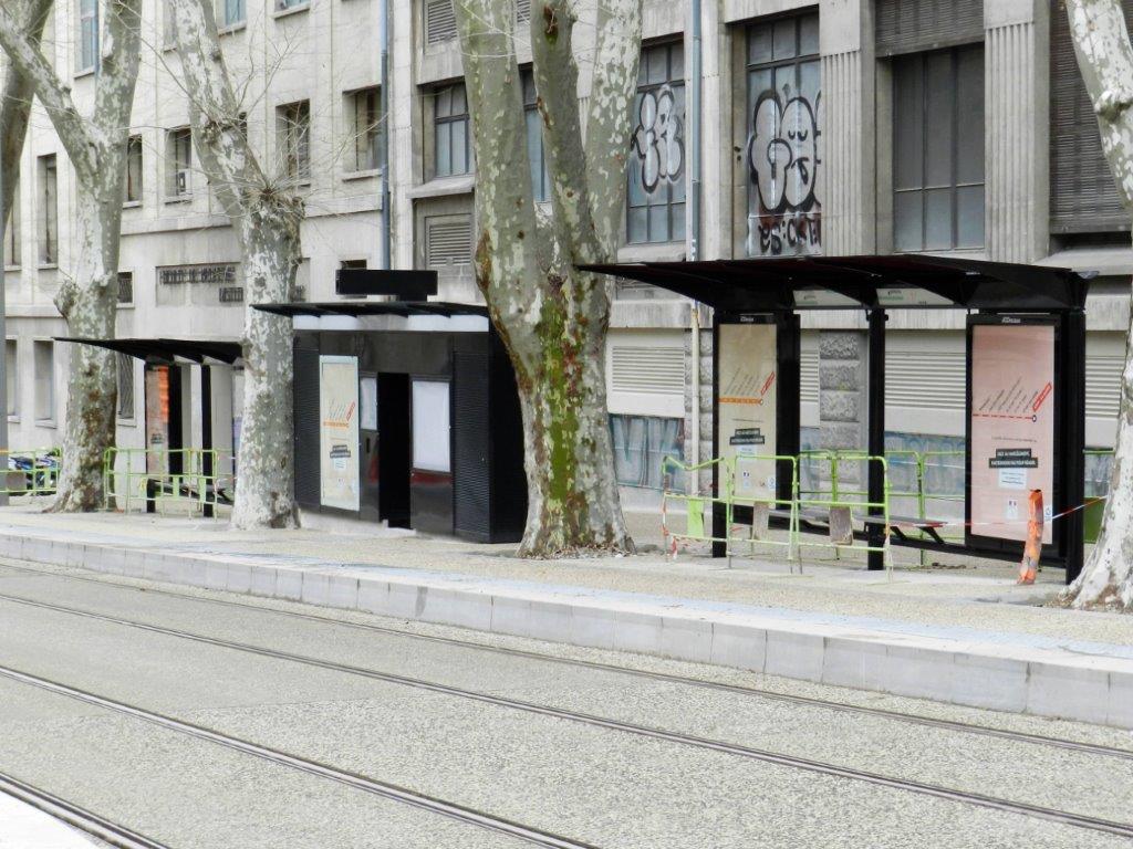 Aperçu du mobilier de station de la future station « Albert 1er – Cathédrale », quai voie descendante, boulevard Henri IV à Montpellier, le jeudi 17 mars 2016. Copyright : Anje34