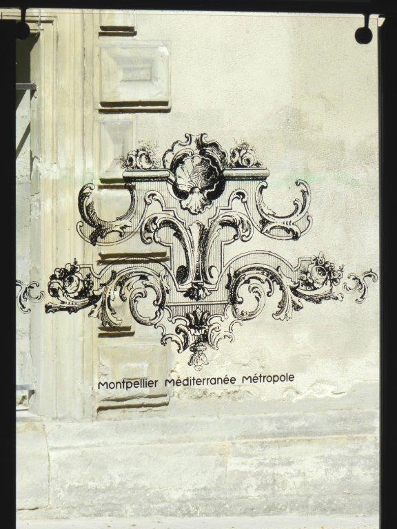 . Paroi vitrée d’un des abris de la future station « Albert 1er – Cathédrale » décorée d’un motif propre à la ligne 4 signé Christian Lacroix. Photo prise le lundi 21 mars 2016. Copyright : Anje34