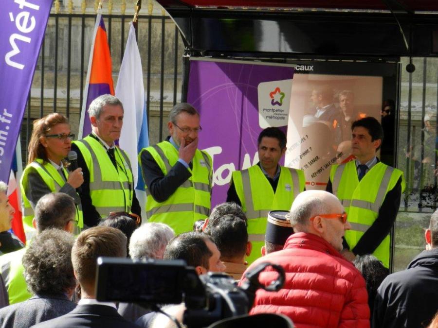 Les officiels rassemblés sur un quai de la future station « Albert 1er – Cathédrale », le mardi 22 mars 2016 après-midi. Copyright : Anje34