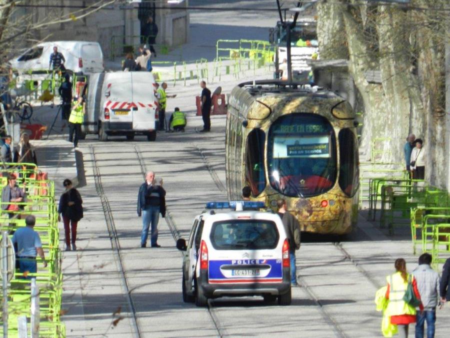 Boulevard Henri IV à Montpellier, la rame 2041 Citadis 302 Alstom descend en direction de la place Albert 1er, le mardi 22 mars 2016 après-midi. Copyright : Anje34