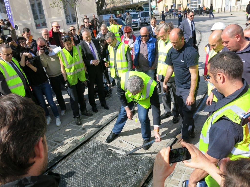 Place Albert 1er à Montpellier, un aiguilleur d’opérette va permettre à la rame 2041 Citadis 302 Alstom d’accéder au tronçon du chaînon manquant de la ligne 4, le mardi 22 mars 2016 après-midi. Copyright : Edgar Chaptal