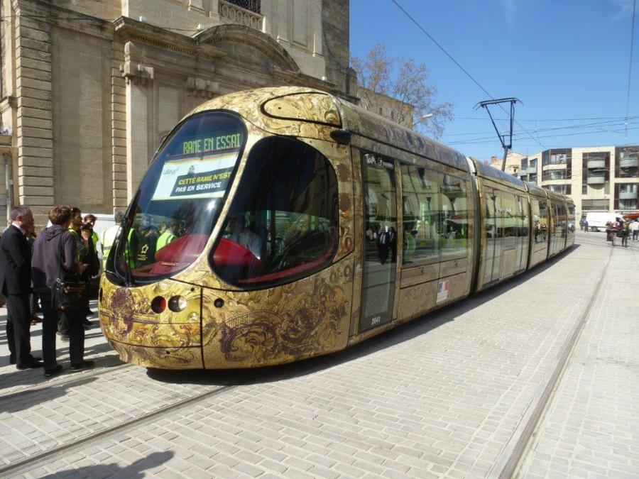 La rame 2041 Citadis 302 Alstom est photographiée sur la place Albert 1er à Montpellier, le long de la façade de l’ancien Hôpital Général, le mardi 22 mars 2016 après-midi. Copyright : Louis Ferdinand