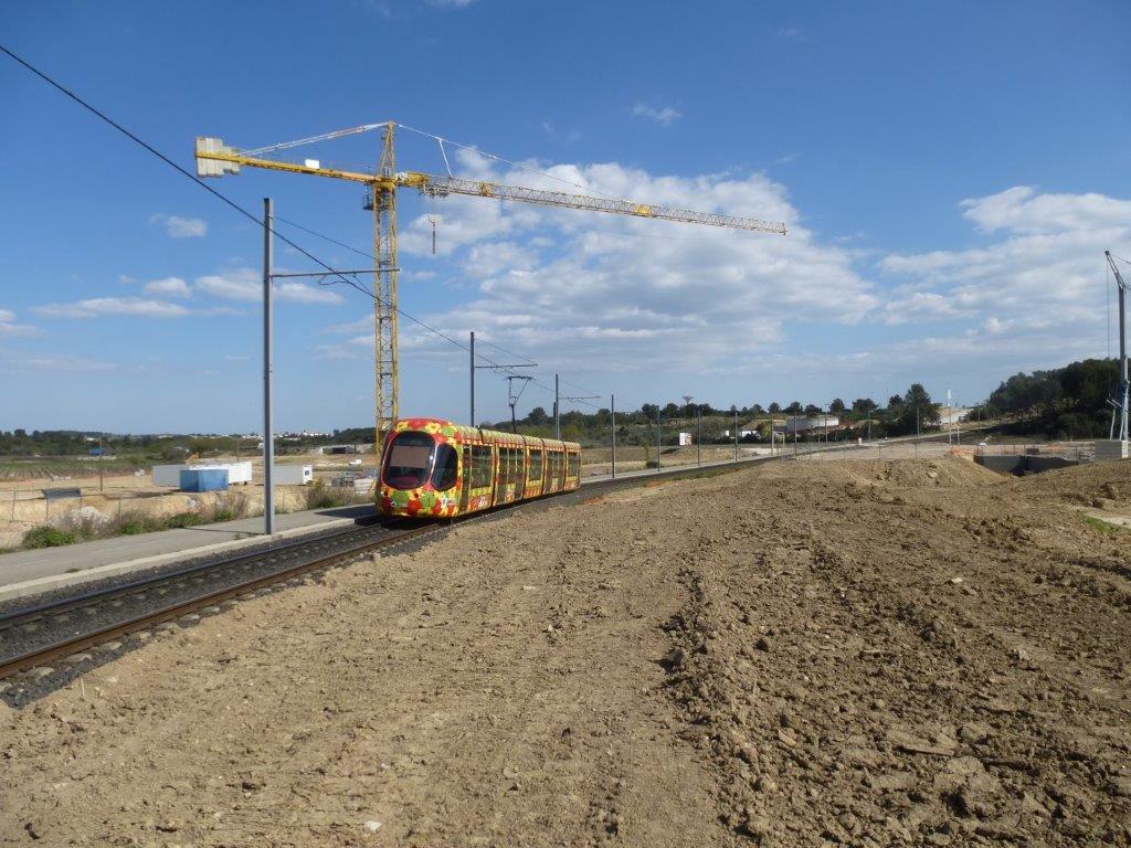 La rame 2054 Citadis 302 Alstom passe au milieu du chantier de l’éco quartier de Caylus à Castelnau-le-Lez, après avoir quitté le terminus « Jacou » de la ligne 2, le mercredi 23 mars 2016. Copyright : Louis Ferdinand
