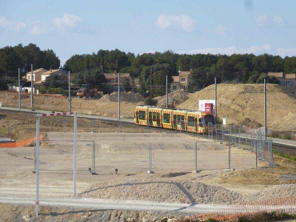 La rame 2058 Citadis 302 Alstom est photographiée à la hauteur du chantier de l’éco quartier du Domaine de Caylus à Castelnau-le-Lez, le mercredi 23 mars 2016. Copyright : Louis Ferdinand