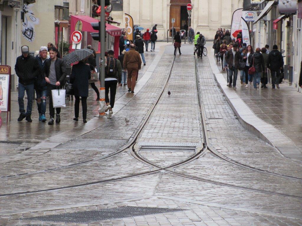 Au premier plan, aiguillage au sortir de la rue du Faubourg-de-la Saunerie sur laquelle ne circuleront à sens unique que les rames de la ligne 3, sauf modification exceptionnelle de l’itinéraire des rames de la ligne 4 bouclée. Photo prise le vendredi 1er avril 2016. Copyright : Edouard Paris