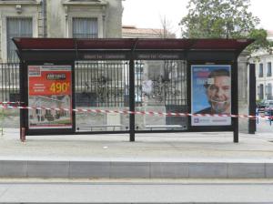 Boulevard Henri IV à Montpellier, sur le chaînon manquant de la ligne 4 de tramway, et même si la station « Albert 1er – Cathédrale » ne sera pas opérationnelle avant le samedi 2 juillet 2016, ses abris voyageurs ont reçu leurs toutes premières publicités commerciales en début de semaine.