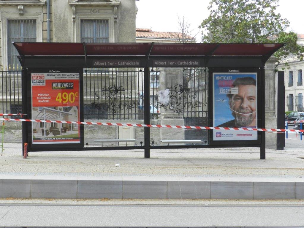 Boulevard Henri IV à Montpellier, abri de station du quai 4b de la future station « Albert 1er – Cathédrale », photographié le mercredi 30 mars 2016. Copyright : Anje34