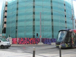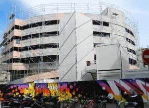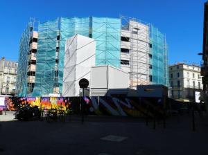 - Habillage du bâtiment des anciennes halles Laissac et du parking éponyme, côté ouest, le jeudi 7 avril 2016. Copyright : Anje34