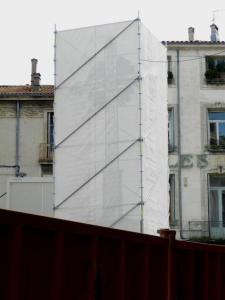 A Montpellier, le bâtiment des anciennes halles Laissac et du parking éponyme cède à son tour à la mode du voile. Question de pudeur avant son désamiantage et son écrêtage étage par étage pour diminuer les projections de poussières et de gravats durant sa déconstruction qui va s’étaler de la mi-avril à la fin octobre 2016.