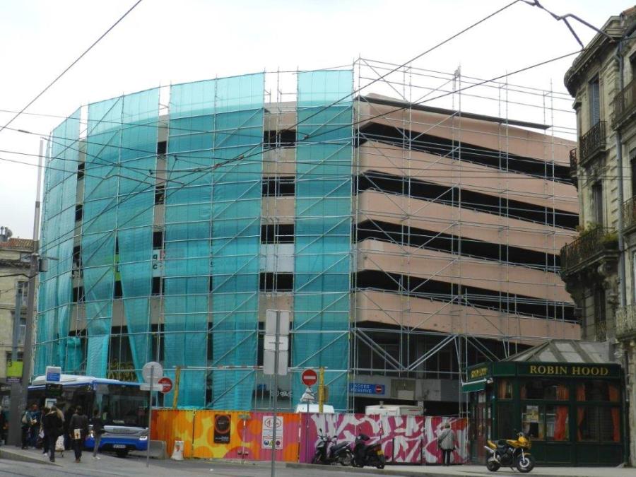 L’ancien bâtiment des halles Laissac et du parking éponyme s’habille pour le printemps-été 2016. Photo prise le mercredi 30 mars 2016. Copyright : Anje34