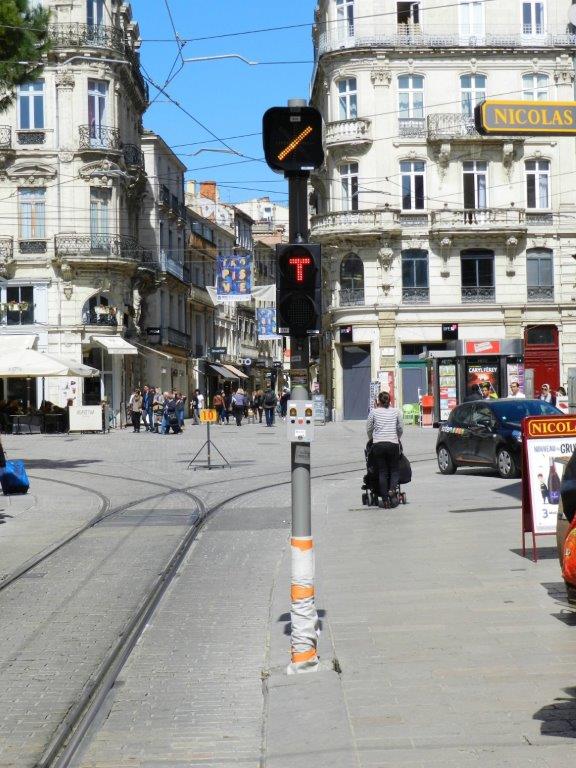 Signalisation lumineuse tramway au bout de la rue du Faubourg-de-la-Saunerie à Montpellier, avant l’aiguillage qui orientera les rames en direction de la station « Observatoire » et exceptionnellement vers le boulevard du Jeu-de-Paume. Photo prise le mercredi 6 avril 2016. Copyright : Anje34