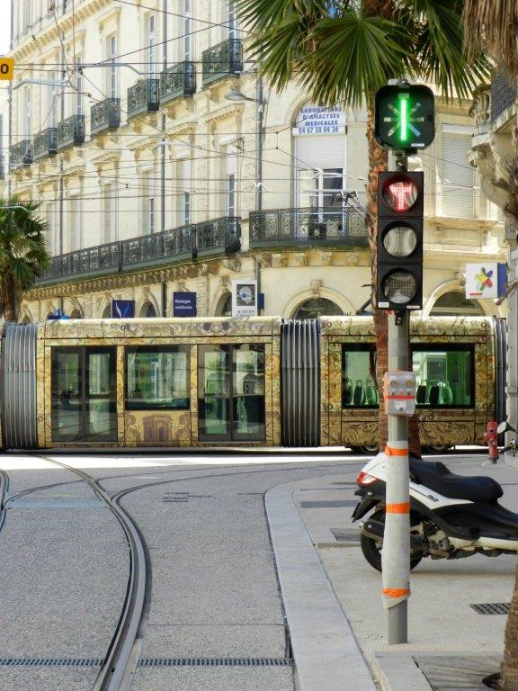 Boulevard du Jeu-de-Paume à Montpellier, la signalisation lumineuse tramway, propre à la ligne 4 bouclée, indique que l’aiguillage orientera la rame vers le bas du boulevard dès que la lettre T s’affichera en vert. Photo prise le mercredi 6 avril 2016. Copyright : Anje34