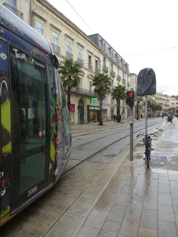 Dans le bas du boulevard du Jeu-de-Paume à Montpellier, signalisation lumineuse tramway protégeant l’aiguillage talonnable par des rames pouvant venir de la rue du Faubourg-de-la-Saunerie. Photo prise, le mardi 5 avril 2016. Copyright : Louis Ferdinand