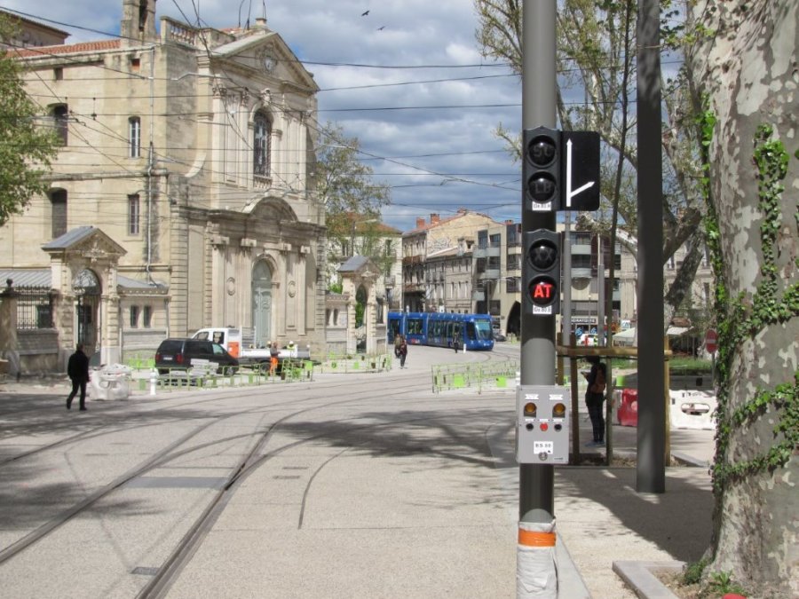 Dans le bas du boulevard Henri IV à Montpellier, la signalisation lumineuse tramway est opérationnelle en vue des prochains essais sur le chaînon manquant de la ligne 4. Photo prise le vendredi 8 avril 2016. Copyright : Edouard Paris