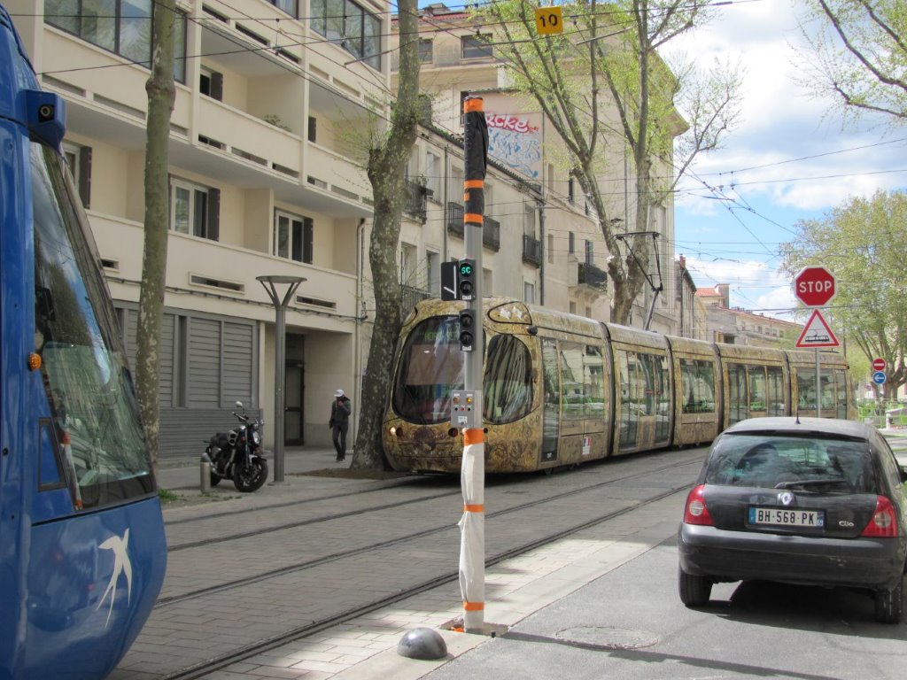 Au bout du boulevard Pasteur à Montpellier, côté place Albert 1er, une rame Citadis 401 Alstom, opérant sur la ligne 1, va être orientée vers l’avenue Saint-Charles. Photo prise le vendredi 8 avril 2016. Copyright : Edouard Paris