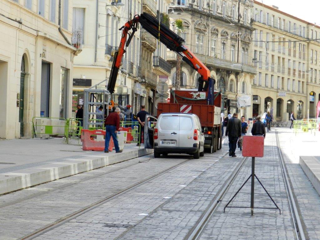 Boulevard du Jeu-de-Paume à Montpellier, les vitres blindées d’un établissement bancaire sont remplacées. Photo prise à la hauteur de la future station « Saint-Guilhem – Courreau » de la ligne 4 bouclée, le vendredi 15 avril 2016. Copyright : Anje34